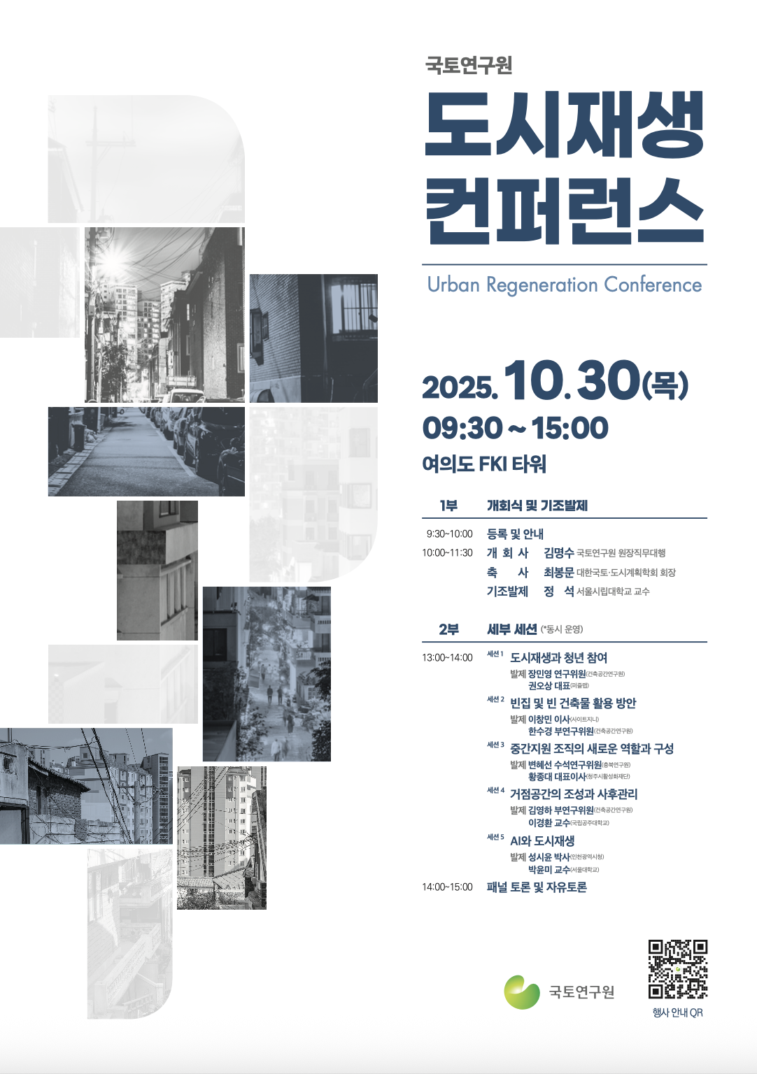 국토연구원에서 10/30(목) 여의도 FKI 타워에서 2025 도시재생컨퍼런스 행사를 개최합니다.