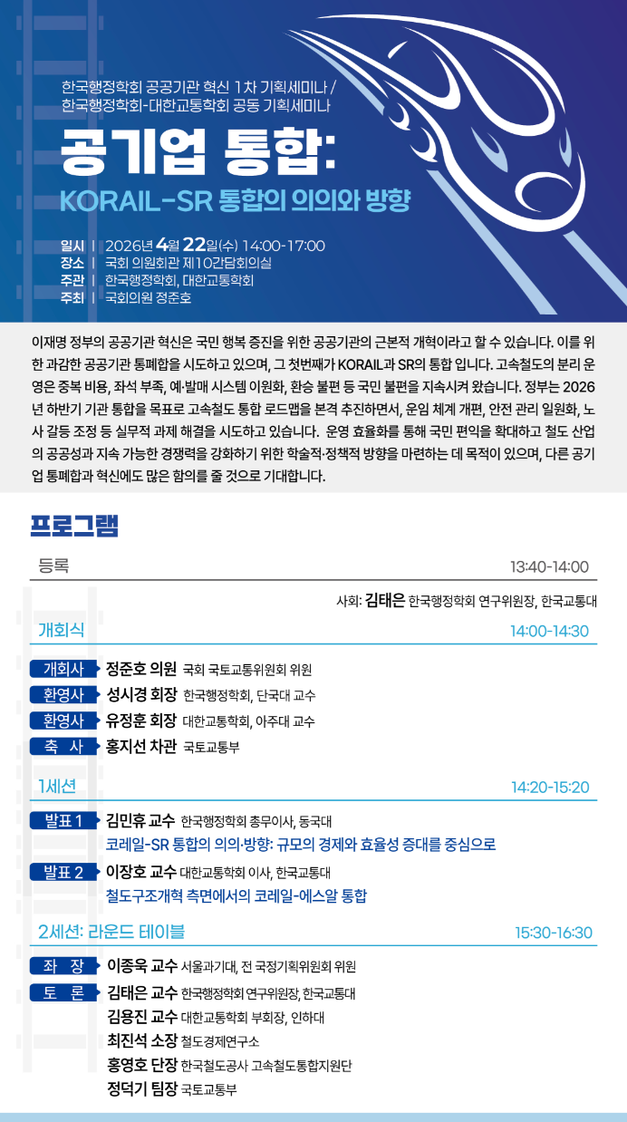대한교통학회에서 [한국행정학회-대한교통학회 공동 기획세미나]를 준비 중에 있습니다.